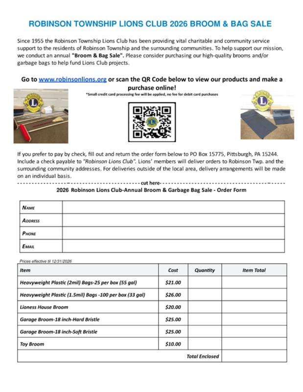 Since 1955, the Robinson Township Lions Club has been providing vital charitable and community service support to the residents of Robinson Township and the surrounding communities. To help support our mission, we conduct an annual Bag and Broom Sale. Please consider purchasing our high-quality brooms and garbage bags to help fund Lions Club projects.